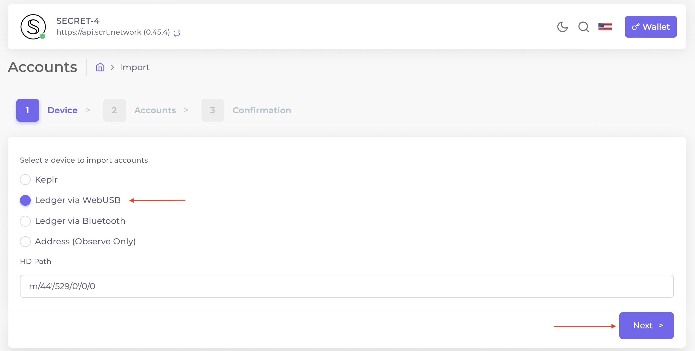 2. Then, select "Ledger via WebUSB" and confirm with "Next".