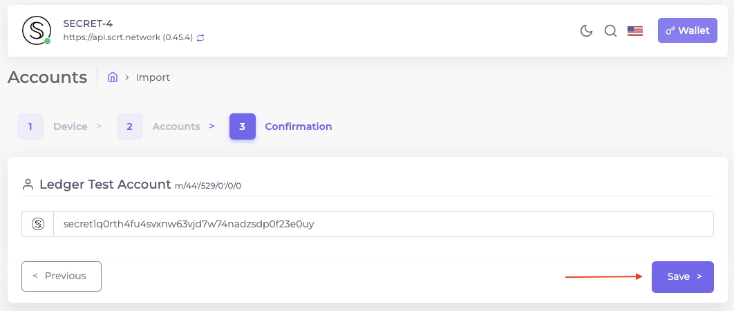 4. Lastly, check the displayed address in Ping.pub against the one displayed on your Ledger device, before confirming it on your Ledger device. Only then confirm with "Save" on the website.