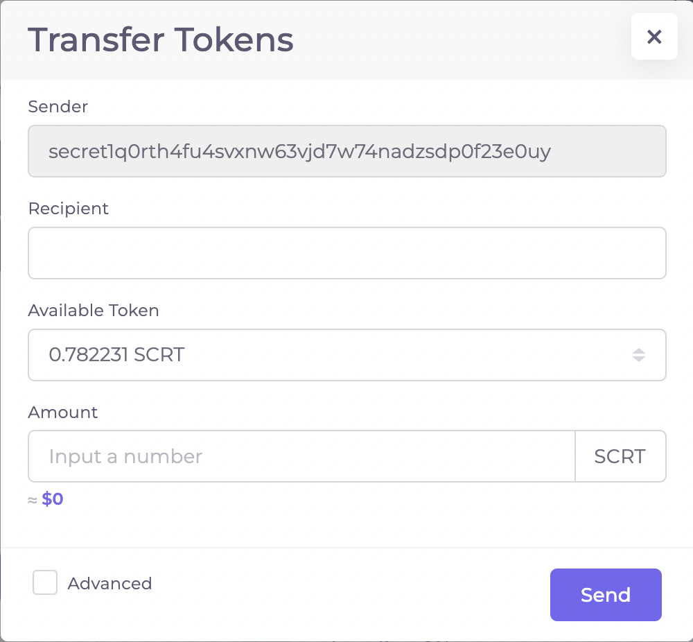 To send SCRT, display your account balance. By selecting "Transfer", a window will appear in which you can input the destination address/Recipient and the amount you want to send.