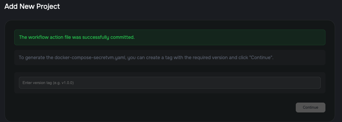The system will generate a GitHub workflow file that will be run every time a new version tag is created in the repository. The Workflow will build a Docker Image for your project following the Dockerfile instructions, publish the resulting  image, and create a docker-compose-secretvm.yaml file properly referencing the newly built image by its hash, and with comments specifying the exact release tag and commit from which the image was built.