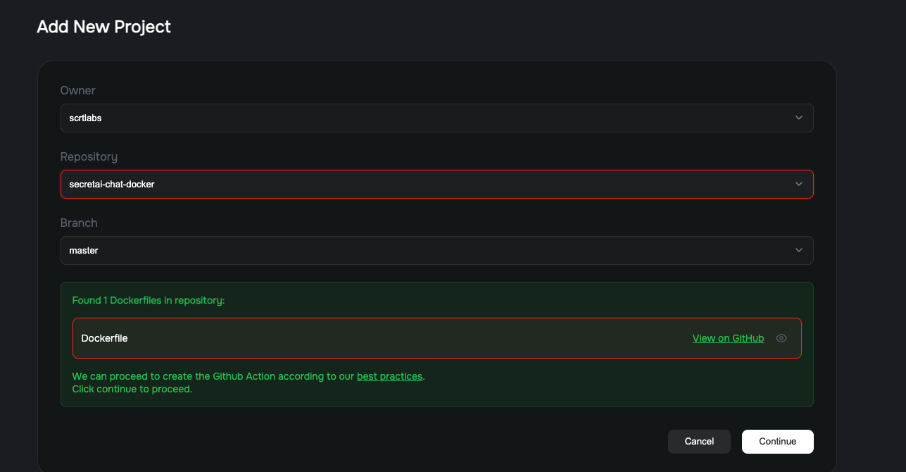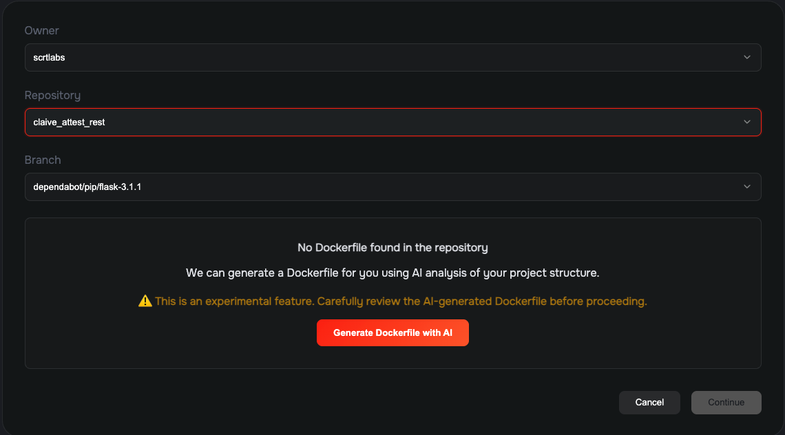 If one or more Dockerfiles already exists, you wil be asked to pick the one you want to use and click Continue