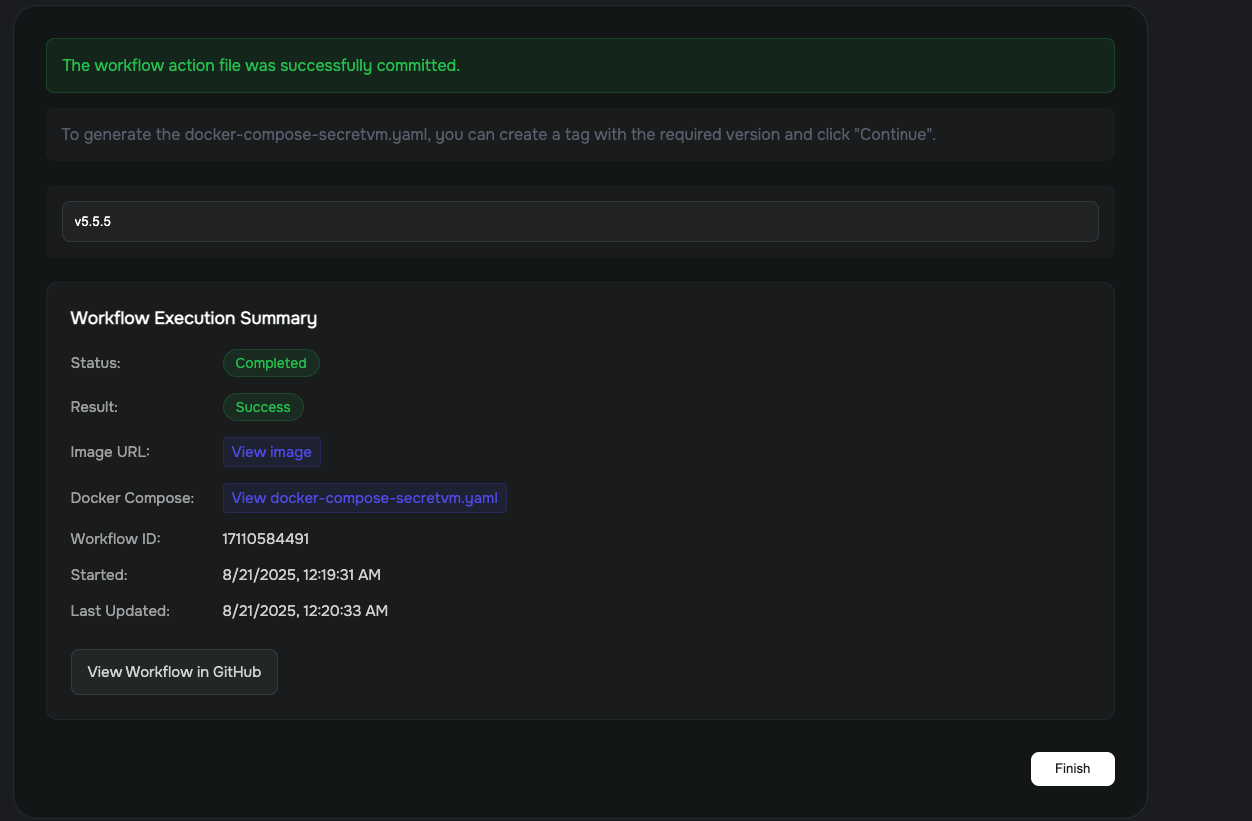 From now on, every time you create a new release of your project, the workflow will be executed, publishing a new Docker Image and updating your docker-compose-secretvm.yaml with the latest version. Make sure to pick docker-compose-secretvm.yaml from your project when creating new SecretVM instances.