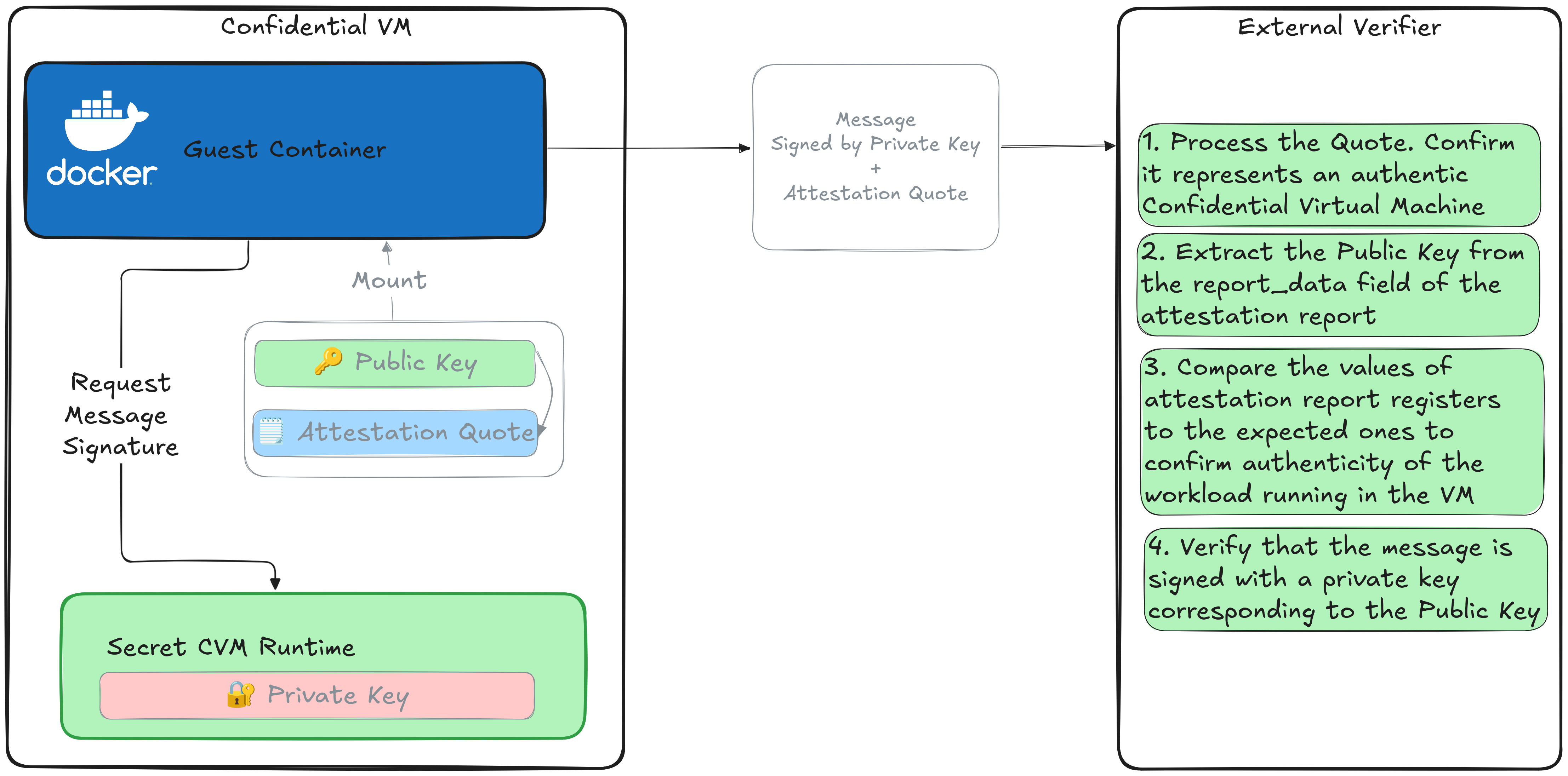 The private and public keys, as well as the attestation quote, can be mounted into the Docker container, and the application can use the private key for signing operations with the assurance that the key has never been exposed outside the TEE. The public key and the attestation quote can be presented to external parties to prove that the signing key is held within a secure and trusted environment, and that the environment is running a specific workload. See [Verifying a SecretVM](https://docs.scrt.network/secret-network-documentation/secretvm-confidential-virtual-machines/verifying-a-secretvm) for more detials.